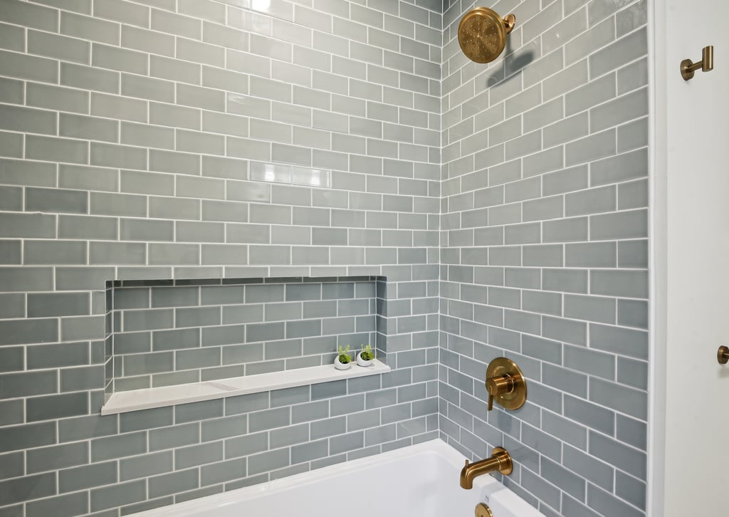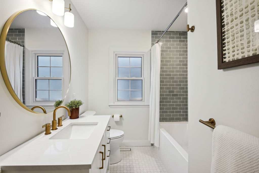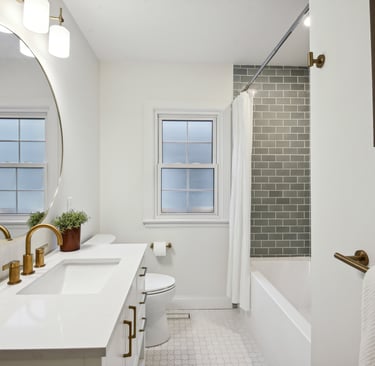 This vintage 40's bathroom received a much needed facelift. Features Fireclay tile and lovely brass fixtures.